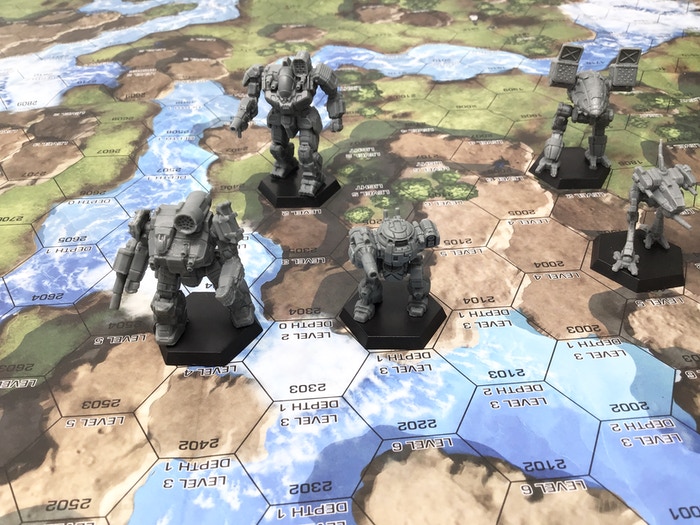 Next we’ve a series of photos of the miniatures for Wave One. Each has been placed on the Kozice Valley (CDS) map from MapPack: Battle of Tukayyid, alongside four ‚Mechs from A Game of Armored Combat: Locust, Catapult, Thunderbolt, and BattleMaster. (In all instances, these are straight out of the boxes, without any primer.)