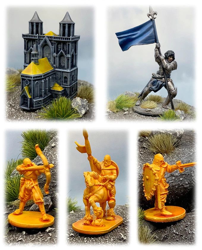 Please note: miniatures come unpainted. Units and production buildings come in coloured plastic (faction/resource colour). Cities, keeps, commanders, churches and special buildings come in grey hard plastic.