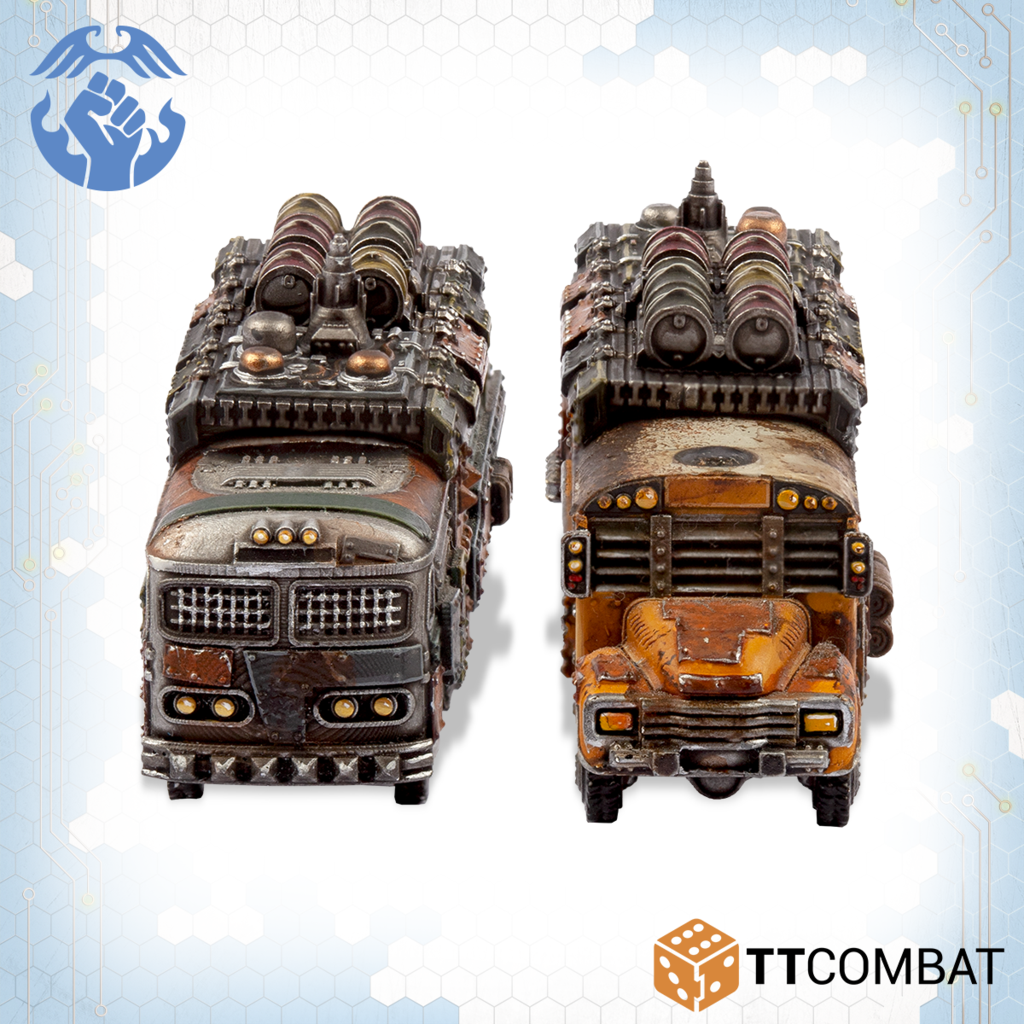 Contains 2 resin miniatures with the choices to make both as Battle Buses or Remote Bomb Buses. Also contains parts to upgrade the Battle Buses with Rocket Launcher Batteries or Heavy Machine Gun Batteries. These miniatures are highly detailed, approximately 60mm in length.