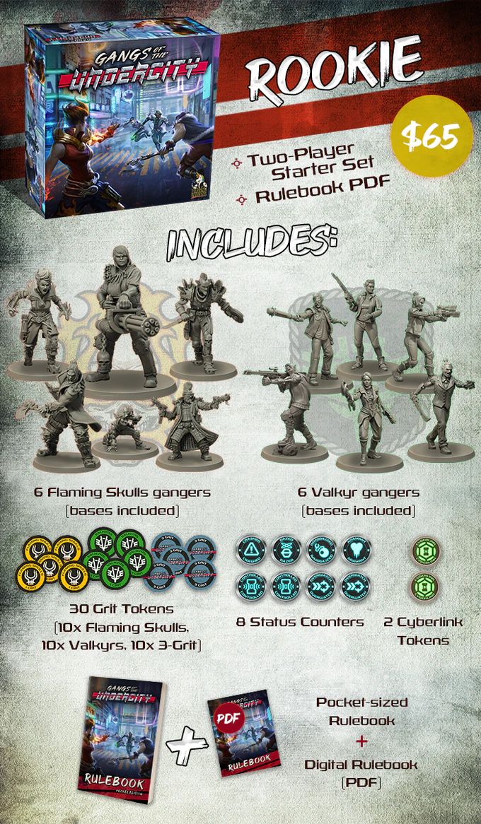All Tiers of Enforcer or above feature our hardcover, fancy 8.5″ x 11″ rulebook. This is all the rules included in the pocket-sized book, as well as tons of setting info, more pictures, painting guides, and extra gang info.