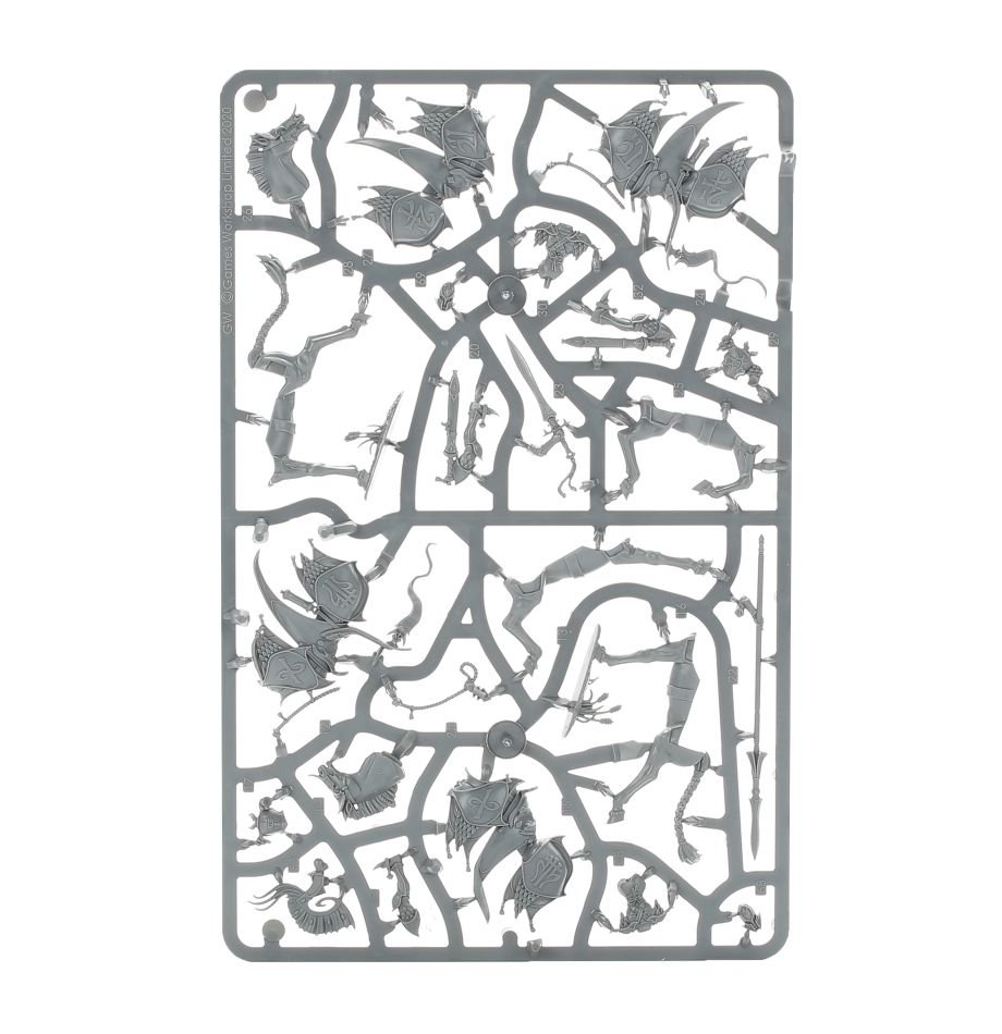 Aus diesem Bausatz können 5 Vanari Dawnriders gebaut werden, und er enthält Optionen, um einen Steedmaster und Standartenträger zu bauen. Die austauschbaren Schilde und Helmzier ermöglichen Individualisierung. Es sind 79 Kunststoffteile sowie 5 Ovalbases (60 mm x 35 mm) enthalten.
