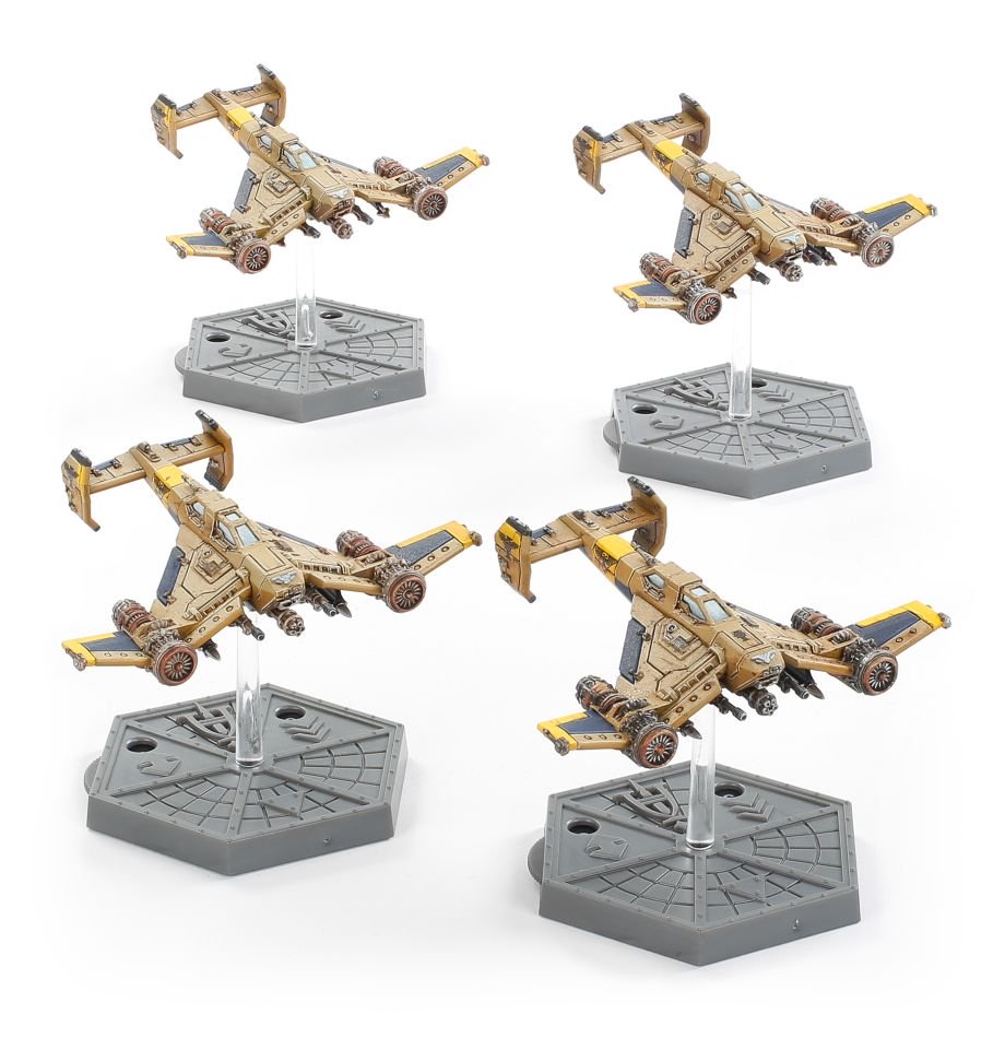 – 4 Aeronautica-Imperialis-Bases (von denen jedes die Front-, Seiten- und Heckbereiche des Modells bestimmt, seine Geschwindigkeit und Höhe angibt und einen durchsichtigen Flugständer bietet, um das Modell darauf anzubringen)