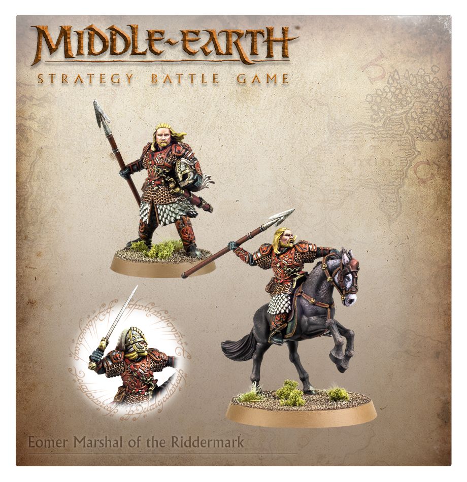 Éomer ist der Neffe von Théoden und einer von Rohans besten Kriegern. Zuvor auf Befehl von Grima Wormtongue ins Exil verbannt, kehrt Éomer zurück, um seinem König in der Schlacht um die Hornburg zur Seite zu stehen. Es ist jedoch im Blutbad auf den Pelennor-Feldern, dass Éomer wahrhaftig zu Ruhm und Ehre kommt. Nach dem Tod Théodens und dem mutmaßlichen Tod seiner Schwester Éowyn kämpft Éomer wie ein Besessener und schmettert Orks, Haradrim und sogar Mûmakil nieder, um die Gefallenen zu rächen.Éomer, Marschall der Riddermark ist ein mehrteiliger Kunststoff-Bausatz, welcher 2 Miniaturen enthält; 1 zu Fuß und 1 beritten im Angriff. Beide Miniaturen bieten die Option, den Helm auf den Kopf zu setzen oder wegzulassen, sowie eine Wahl zwischen Wurfspeer oder Schwert in einer Hand und Schild oder Helm in der anderen. Beide Miniaturen tragen eine Schwere Rüstung, und das Pferd kann entweder ungeharnischt belassen oder mit Schuppenharnisch versehen werden.