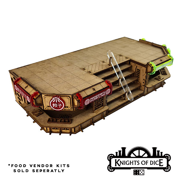 https://www.knightsofdice.com/product/shirrow-ave-tunnel/Next is the super clever Foodcourt Rooftop platform, designed to work with our existing food vendor kits. The platform contains corner spaces that the food vendor kits „slip“ into (like a drawer) to create a rooftop platform with a staircase for you to fight over. We think these look amazing with two of them back to back to accommodate all for food vendor kits, which even provides a platform large enough for some of the easy district buildings!