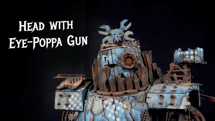 Orc Boomkilla Deffstomper is a more sophisticated version armed with a massive belly cannon, a close-combat Krushin′ Klaw, a Traktor-Kollida gravity cannon plus an Eye-Poppa gun mounted on a walker′s head!