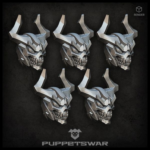 Set containsFive models of Demon HelmetsDescriptionModels designed to fit 32mm tabletop wargames scale as alternative heads for various types of infantry. Supplied unpainted.DimensionsHeight from neck to the top of the head 8mm. Max width 7mm.MaterialHigh-quality resin.CompatibilityInfantry and heavy infantry (H.I.) models.