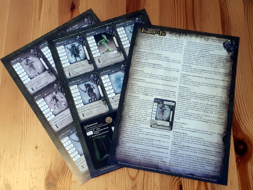 Zusätzlich sind 3 doppelseitig bedruckte Bögen enthalten: Zunächst wären da die Regeln für diese neue Fraktion. Dazu kommen zweimal derselbe Bogen aus etwas stärkeren Papier mit den Karten welche zum Spielen benötigt werden.