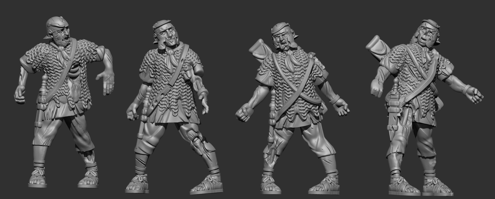 We will be going live with our next Kickstarter campaign on Friday 9th October. This campaign is to expand on the one we ran last year and will start with 28mm Imperial Roman Undead.Each pack contains four miniatures along with a sprue of four heads and separate shield arms if appropriate OR three miniatures with a sprue of three heads and separate shield arms if appropriate for command packs. The left arms have a plug attached to the forearm which fits into a hole on the rear of the shields. The miniatures will have integral bases (similar to historical wargames miniatures) NOT slot/tab bases and will be produced in white metal.Having the shield arms and heads separate will allow a certain level of customisation to your units, allowing a mix of weapons, shield designs and helmet designs/heads. The heads and arms are designed to fit any pack from that armies/period Undead where appropriate.The separate heads have ball joints on the necks to allow a lot of possible positioning of the heads to give that undead/zombie look!Ancient Gauls will be the first Stretch Goal army.