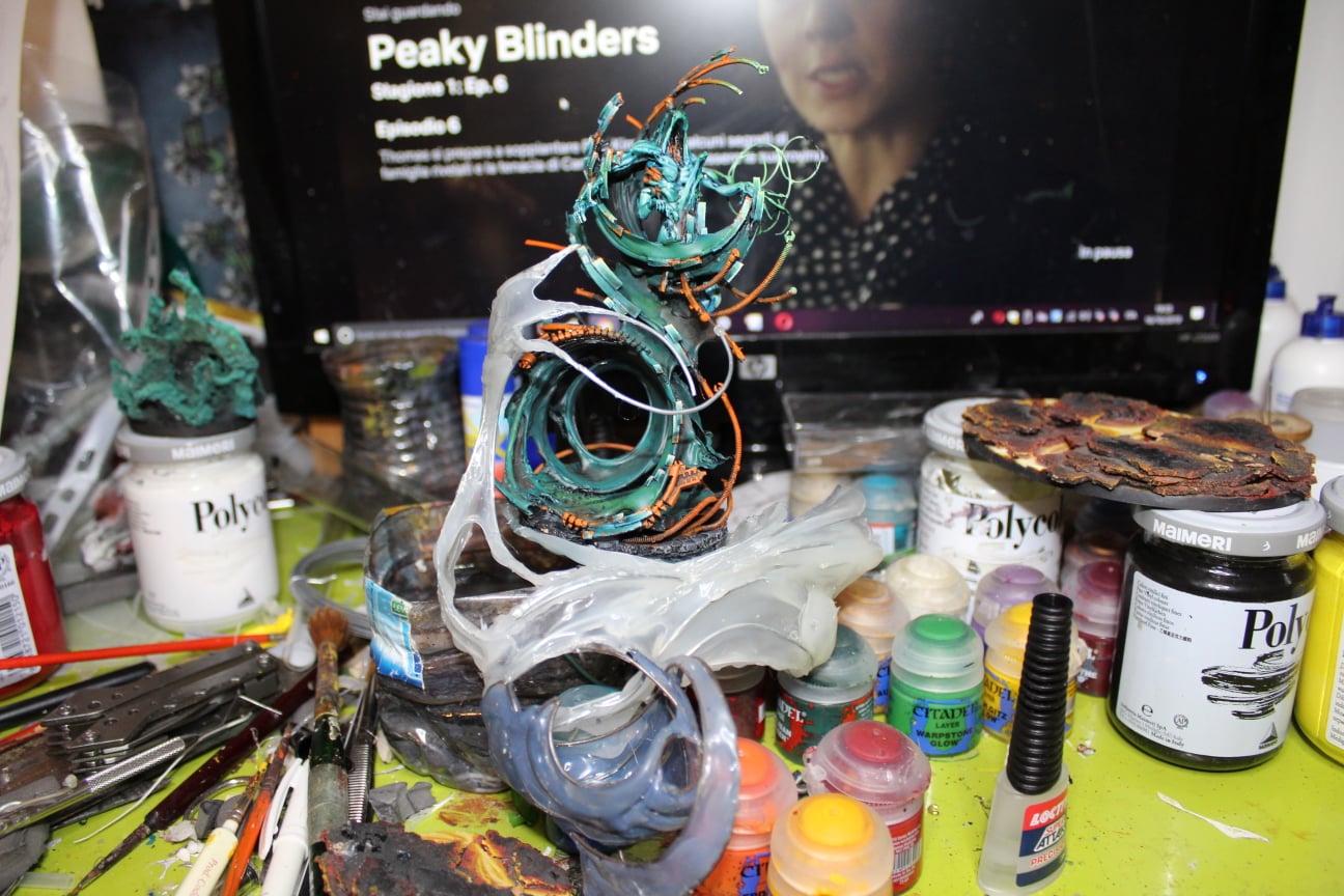 i started the necron with the lore of the first codex, where both the Dragon and the Outsider had been releted by mortals as the machine god, there was no description of their form and the little we knew was about the madness of the Outsider and the fire of the Dragon. in the last page of the 5th edition codex there is a profecy which talk of each of the four remaning c’tan and to me it seems The Dragon concept was the forge, the eternal flame of the machine feeds by the ashes of his slaves. the Outsider instead is an architect of inverted geometries and labirintic design of madness so in my mind they evolved as you see. you want to count this as the dragon? or the Ommissiah? or a tzeentch’s demon prince? go ahead, for me he isthe C’tan RAIHNI’MAK THE OUTSIDER,