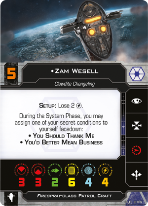 Alternatively, she has the chance to retaliate against a ship that attacks her while she has the You’d Better Mean Business condition. So long as she can carefully manage her charges, Zam Wesell remains an enigmatic and menacing opponent.