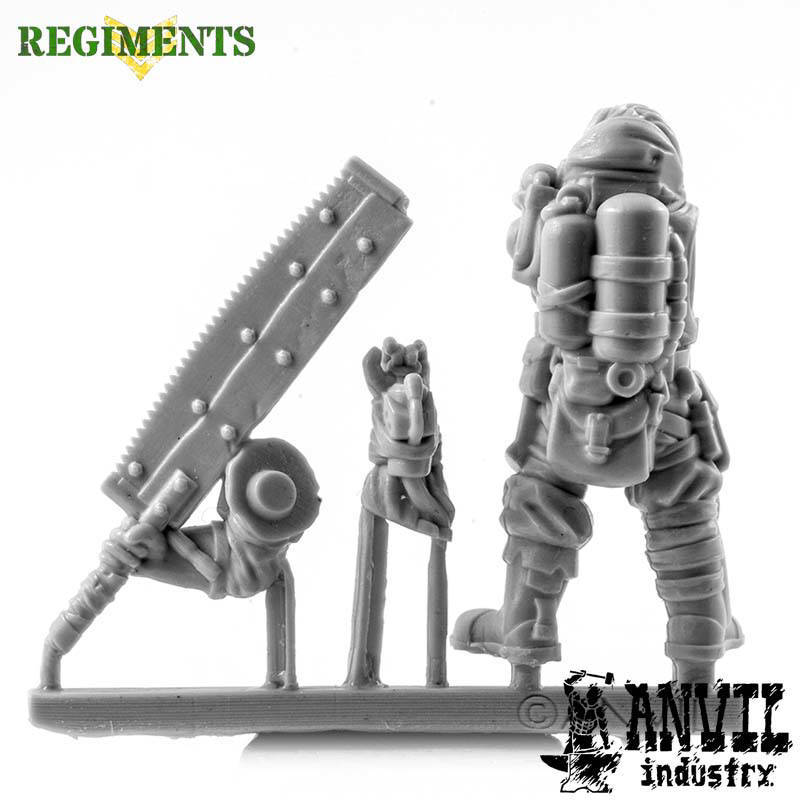 This miniature comes in 3 parts with the arm holding the saw-blade as a standard Regiments arm joint, allowing for extra, easy customisation.