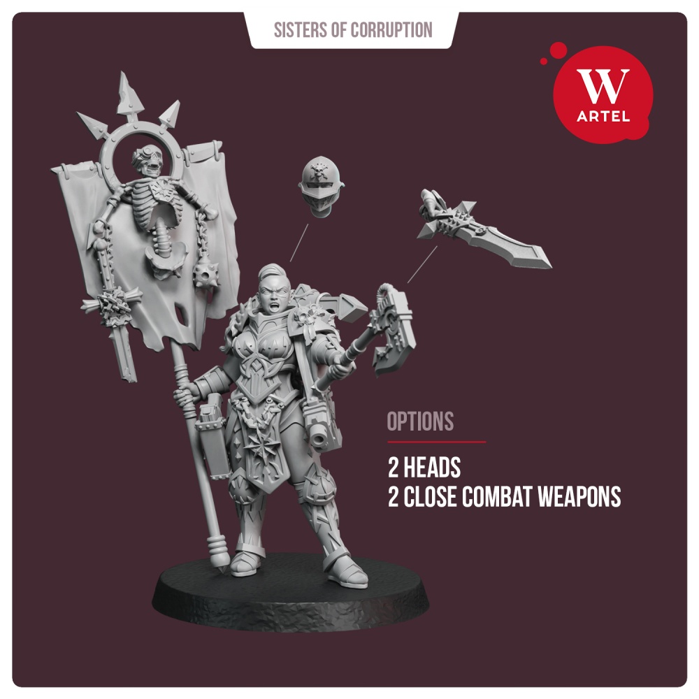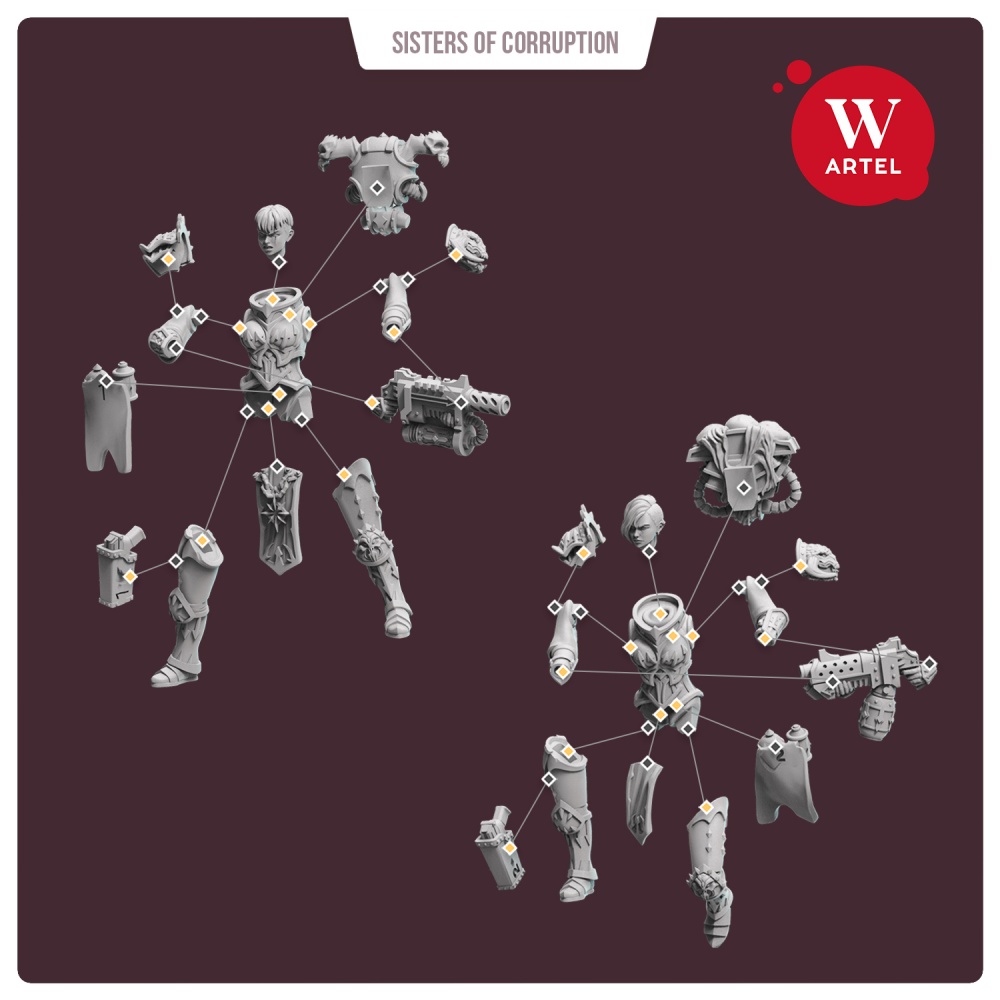 The kit contains 84 parts for 4 Sisters of Abyss and 1 Sister Superior miniatures, with multiple options. Also, you can add Sister Damnatrix and Bearer of Unholy Relic to the kit in the Options section.