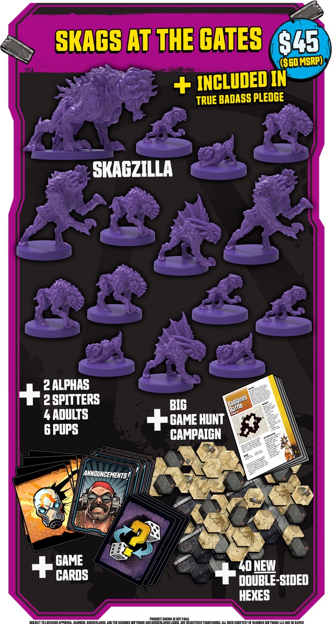 - 15x miniatures: 1x Skagzilla, 2x Alpha Skags, 2x Spitter Skags, 4x Adult Skags, 6x Skag Pups,