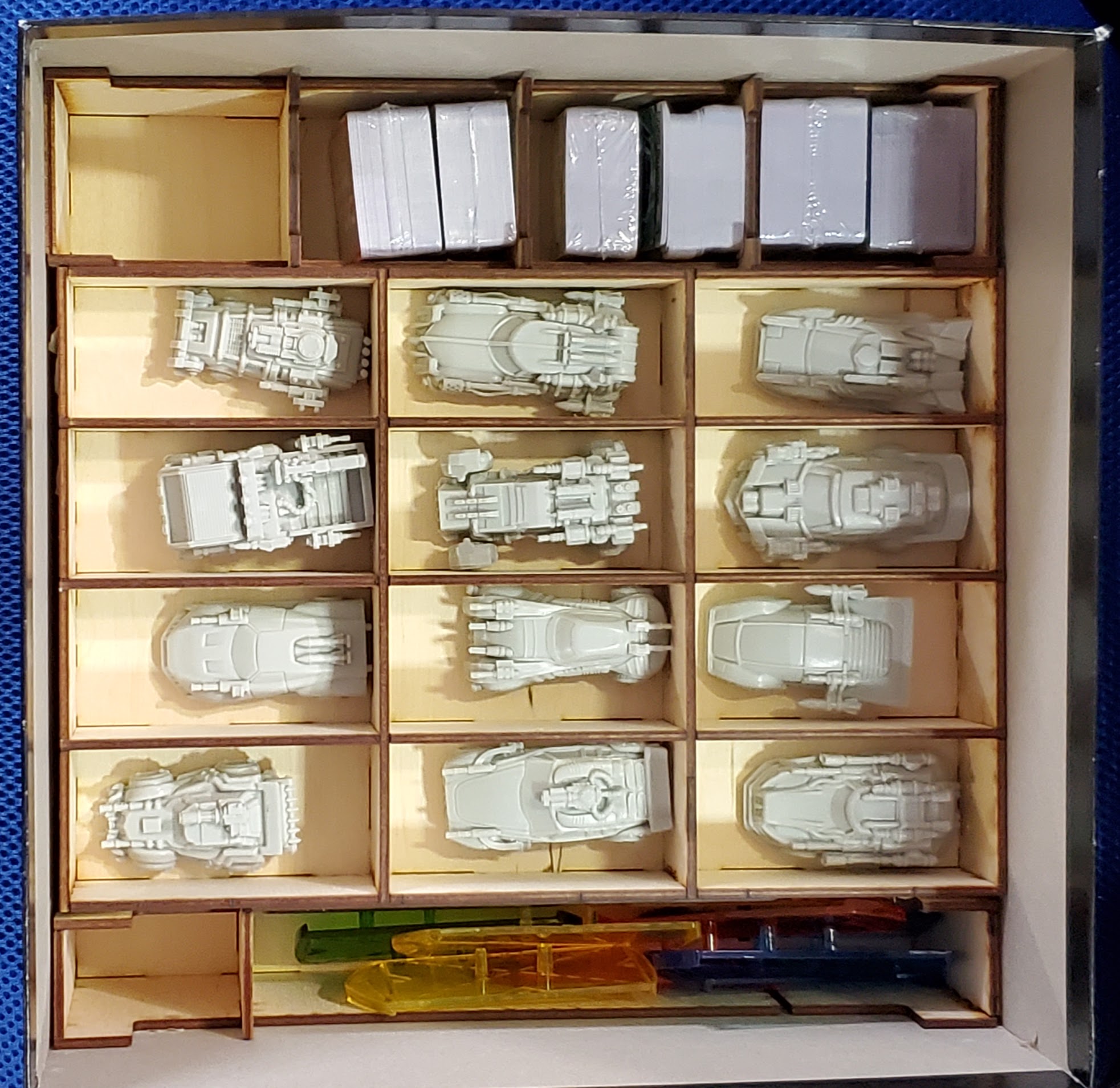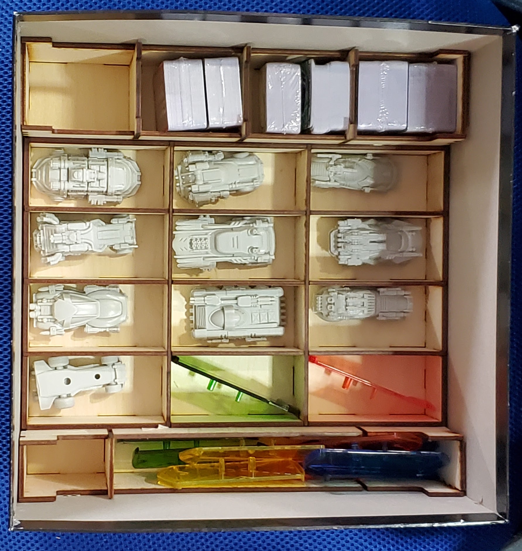 Working on some new trays/organization units for the Car Wars 6e box. This set holds all the components currently shipping with the Double Ace box and has space for additional cards, tokens, and templates so you can keep all the kits in a single box.