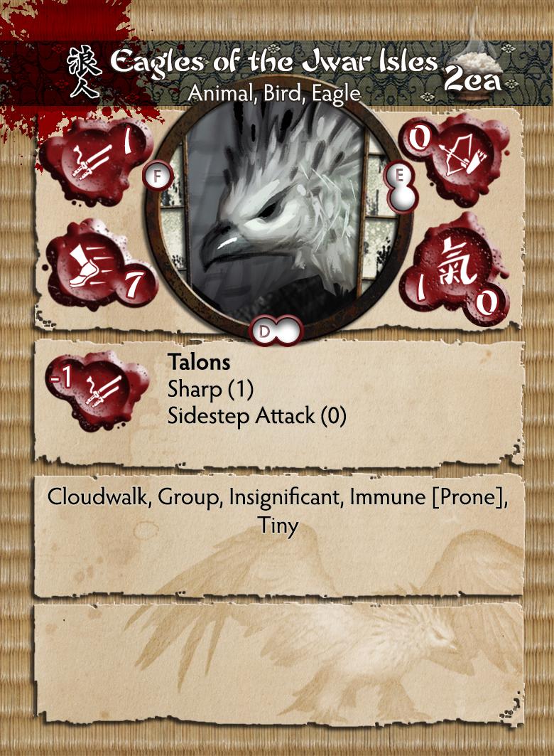 The eagles from across the Jwar Isles come to the call of the Tengu. Great, majestic, aerial hunters, undisputed kings of the sky across most of the empire. Eagles are huge birds of prey, some able to lift off a whole goat using their massive wings. Recently, the eagles have also come to the call of another, a human blessed to carry the Mon of the Eagle clan.