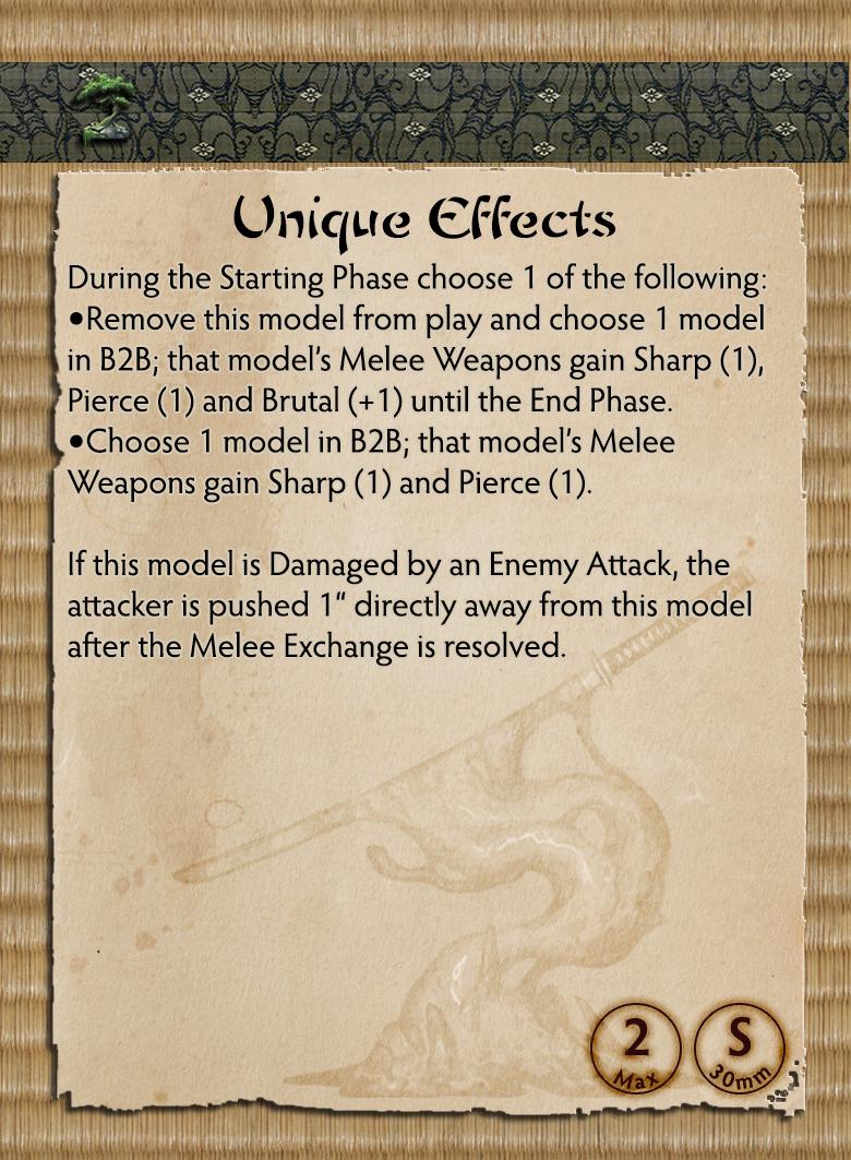 Another ranged option for Bastions of the Mountain, providing different abilities to tailor your list exactly how you want it. Ichiro also has a good support feat, vital for making your cheap peasants able to (maybe) hold their own versus Bushido’s best fighters.
