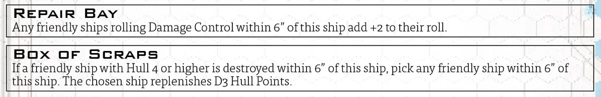In-game these abilities are represented by a couple of rules! The Repair Bay allows the Triumvir to project a bubble to friendly ships, helping them to fix their Crippling damage mid-game. Meanwhile the Box of Scraps rule relies on close-by wrecked ships to help patch up holes in others. Stick the Triumvir in the centre of a larger group and you’ll be set. It’s worth keeping a group of cheap Frigates close (maybe take a couple of Detector Frigates) to provide parts for other ships. Keeping other Battlecruisers or Grand Cruisers nearby means your opponent will struggle to remove them from the game before taking out the Triumvir, which – considering it only has a token Close Action weapon and some Fighters & Bombers – might be a bit of a waste of firepower.