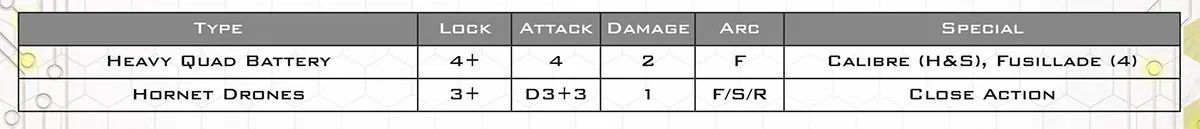 The Pompeius is armed with a heavy version of the Castor’s Quad Battery (very fitting considering the Monitor design was Dave’s main inspiration for the ship). The Heavy Quad Battery mostly matches the Castor’s weapons, but bumps up the Damage stat to 2. In addition, the weapons have Calibre for Heavy and Super-Heavy ships, increasing its Lock value.