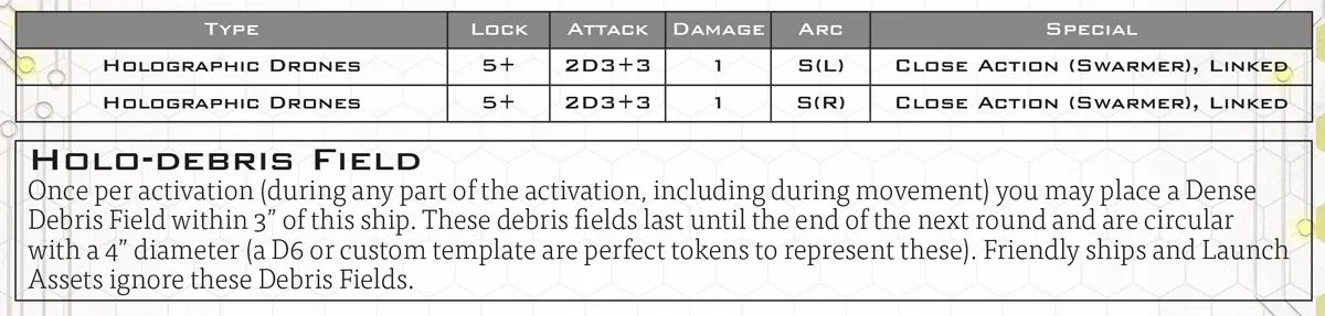 Those long fins house layers of drones within drones, each equipped with EM projectors, which – when all together – create a web of EM interference, mimicking that of debris fields. The drones are also self-detonating, meaning any admiral brave enough to fly through the ruse will find smaller ships often damaged beyond repair. In game terms these Holographic Drones manifest in two ways: