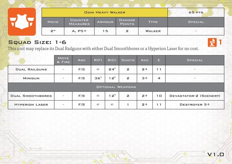 The Odin Heavy Walker used to be a single unit with no options. As did the Enyo and the Hyperion. With a wave of a magic wand, now they’re all in one sheet! You can take the Odin with Dual Railguns, or swap them for Dual Smoothbores or a Hyperion Laser for no points. They all function pretty much identically to how they did before, but it only takes up one space on the army builder, so you don’t have to flick between the units to find out which is best for the role you want.
