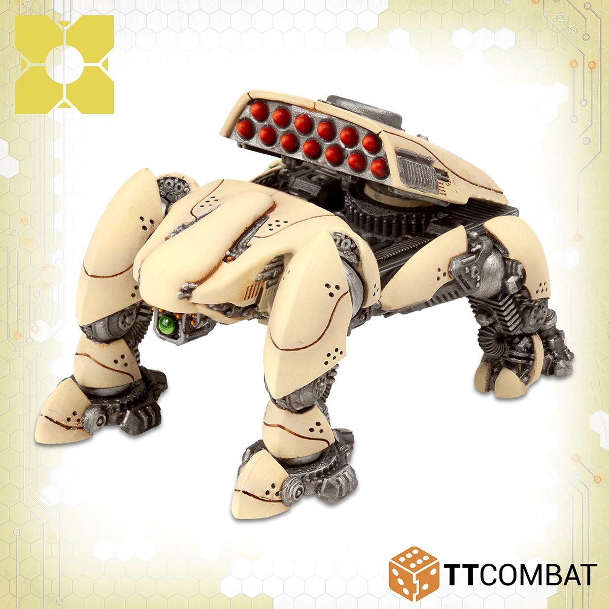Implacable is a word synonymous with the PHR offensive, and nothing is more-so than the Tlalocan Taranis. First encountered on the Cradle World, this design replaces its weaker tracks with a sturdy PHR walker chassis, the relative loss of speed entirely mitigated by the Taranis‘ stationary battle role.