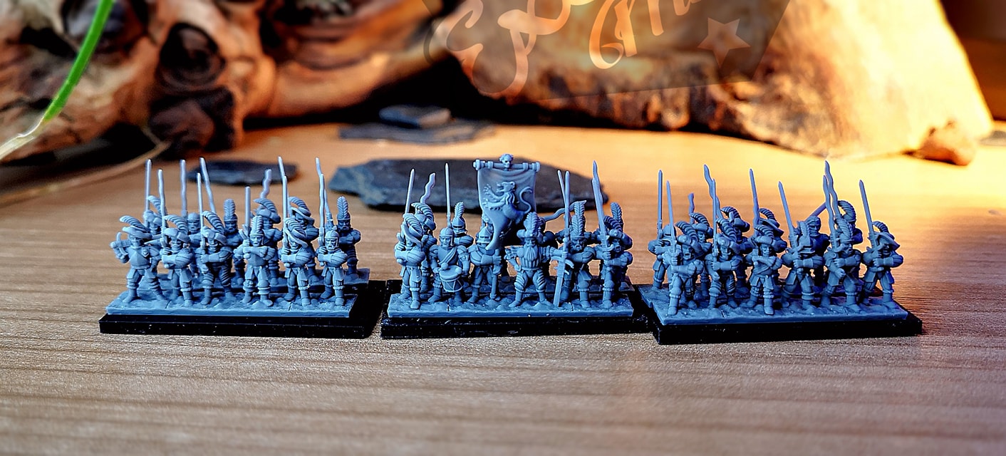 Empires of Men – Great swords finally released (collab with Andre Beloff)!Also hobgoblin wolfriders for Chaos Dwarves (by Ankylo Miniatures) and Scout riders for Shadow Elves (by MoonJammy). And an alternative commander/sorcerer for the Undead. A huge Crypt lord from Artisan Guild.And.. A sneak peak at the first prototype for Halberdiers. Going for a bit of nostalgia here. The halberds shaft is obviously too thin in the prototype.