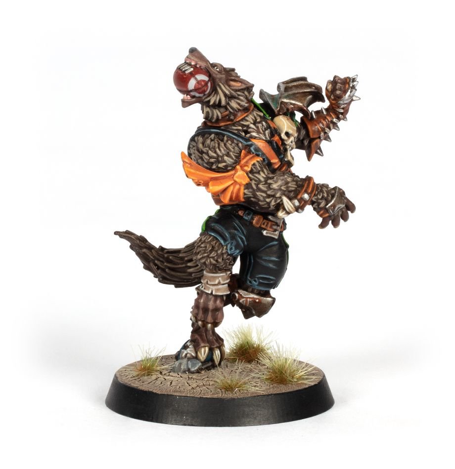 Rat Ogres are natural Blood Bowl players with size, speed, and animal cunning that make them sought after by Skaven coaches all under the world. You could wait for them to improve through experience and careful training, or you can simply enhance them with warpstone-powered mechanical augmentations and give them a massive weapon to swing around. Such is the case with Kreek ‘the Verminator’ Rustgouger.