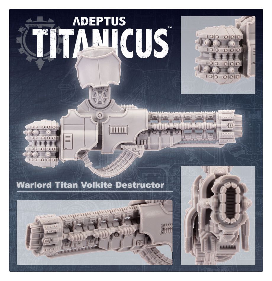 Volkite destructors are among the largest and most powerful volkite weapons mounted on the Titans of the Adeptus Titanicus. Able to blast through Void Shields with ease and kill weakened Titans with the fury of Mars itself, they’re popular among the more belligerent Titan Legions.