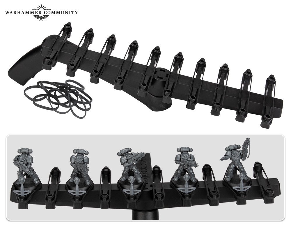 Tired of working on hard-to-reach pieces while painting? The sub-assembly holder contains 44 part holders made from the same plastic as Citadel miniatures, so you can easily glue small pieces like heads and weapons onto them for comfort while you’re painting, then clip them off and glue them to the model. They also come with two fluted bases that work perfectly with Citadel Colour painting handles.