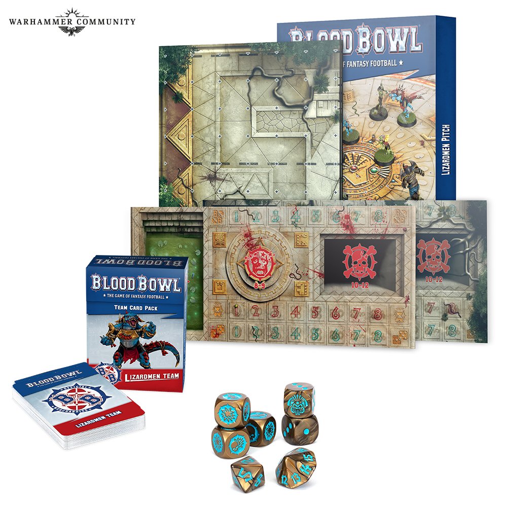 Meanwhile, under the loving gaze of Nuffle, a set of releases is coming for one of Blood Bowl’s more monstrous teams. A Team Card Pack, Dice Set, and Double-sided Pitch and Dugout Set is available to pre-order for Lizardmen teams from Saturday. If you coach this team, it’s a good week to add some crucial accessories to your roster.