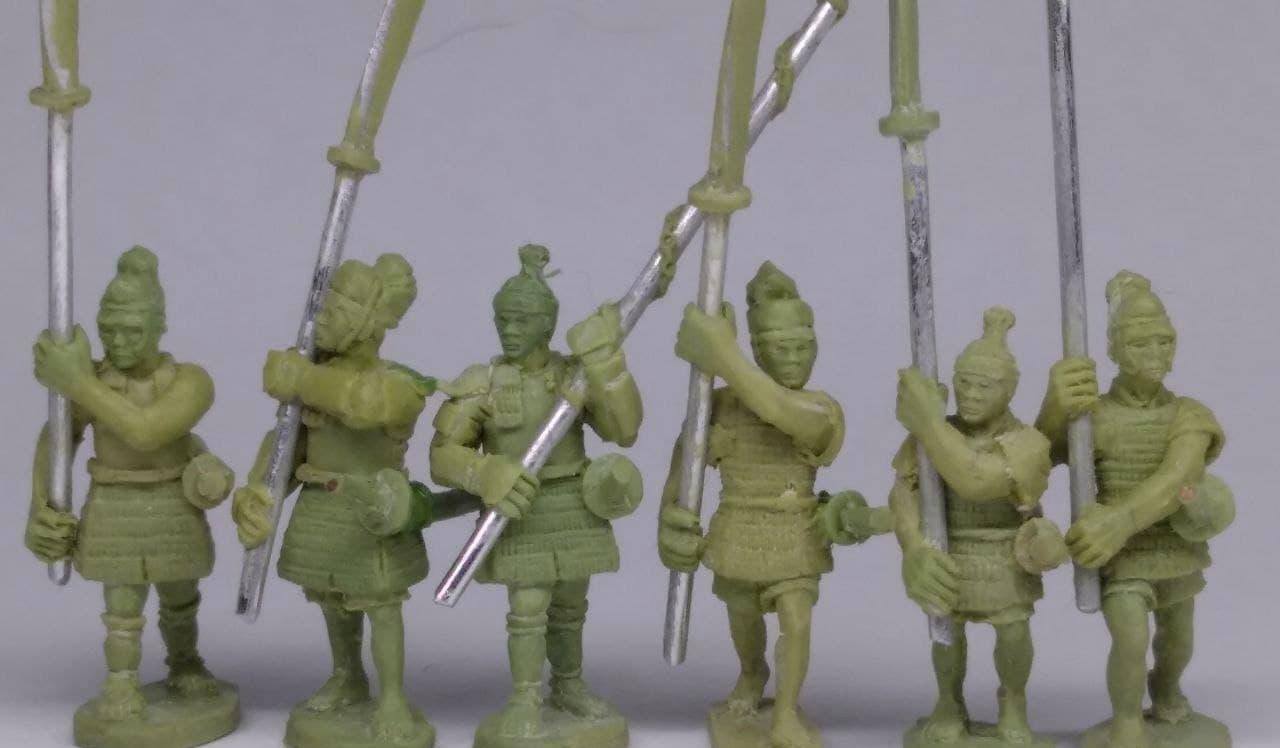 Early samurai period retainers — including one with bear claw spear! Because we had to have one. (Four others have naginata and one has a hoko yari.) Three are in very cheap, light armour, three others are better protected.