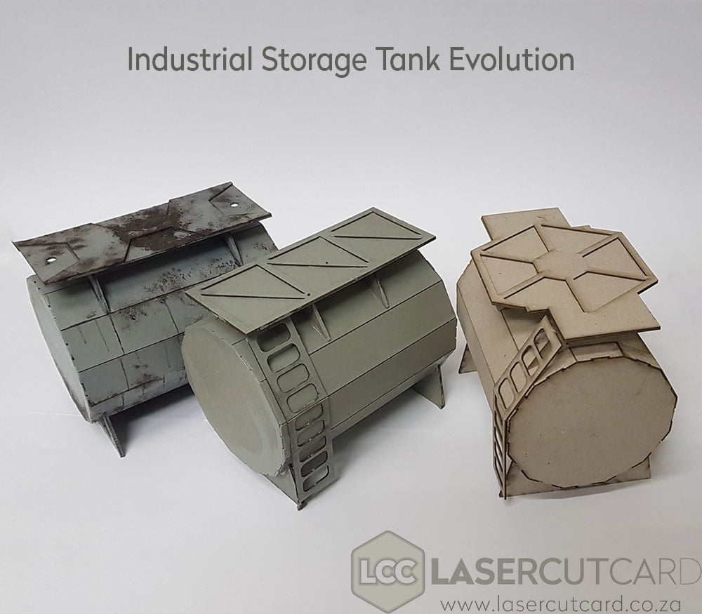 The final version of a new piece in the „industrial“ range is done: a storage tank.This has gone through several iterations.One the left, the original (fully painted)In the middle, v2, Vis1 ladders added, sturdier platform (undercoated)On the right, final. Vis1 ladders on both sides, wider platform for bigger models.The entire range will hopefully be available at 4Ground soon.