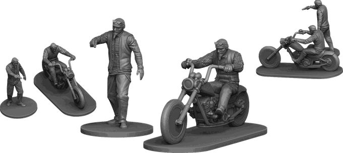 Eine Gang hat hat 5 verschiedene sitzende und 5 verschiedene stehende Miniaturen, wobei eine stehnde dann eine sitzende korrespondiert. Und dann noch 5 Motorräder mit 4 verschiedenen Modellen???