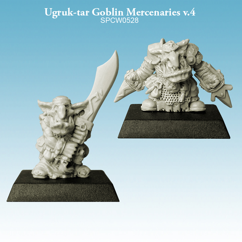 Set contains 2 resin miniatures of Ugruk-tar Goblin Mercenaries v.4 and 2 bases (25 mm x 25 mm). High-quality resin casts. Require assembling, cleaning and painting.