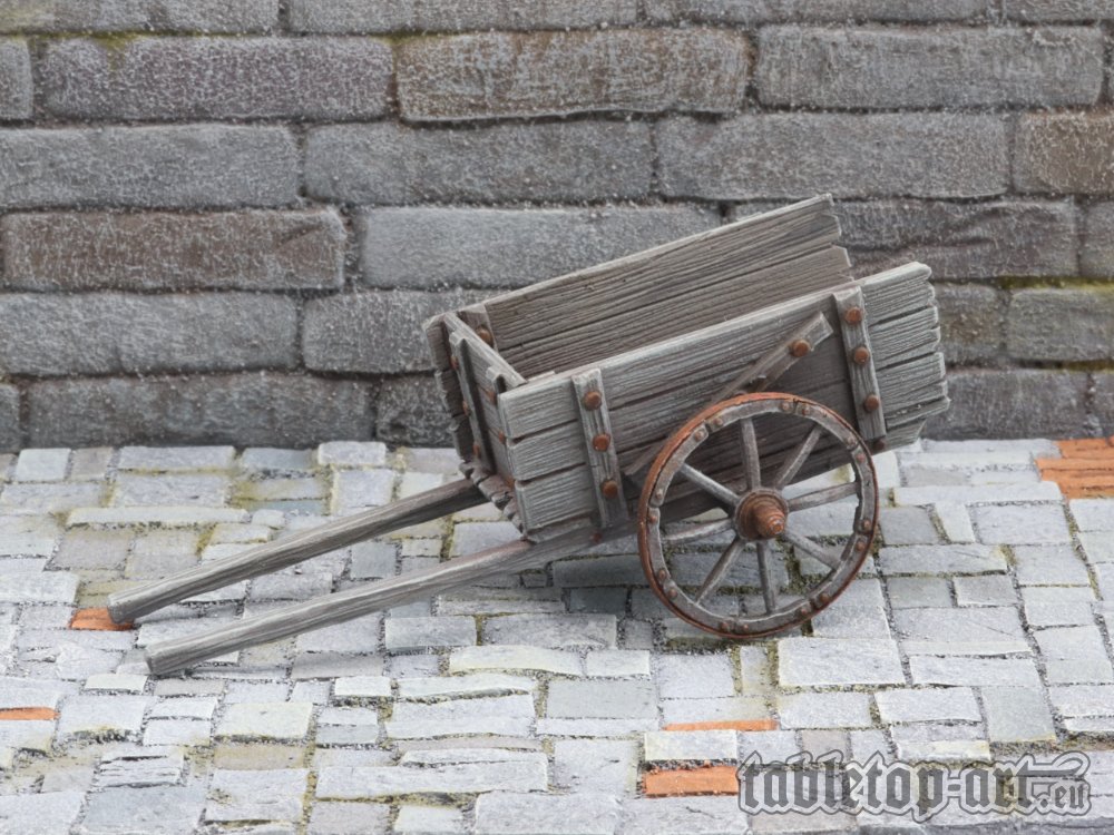 Das Set beinhaltet einen kleinen Wagen im Maßstab 28-30mm. Der Bausatz ist aus Weißmetall gefertigt und muss zusammengebaut werden. Das Fass ist aus Resin gefertigt.