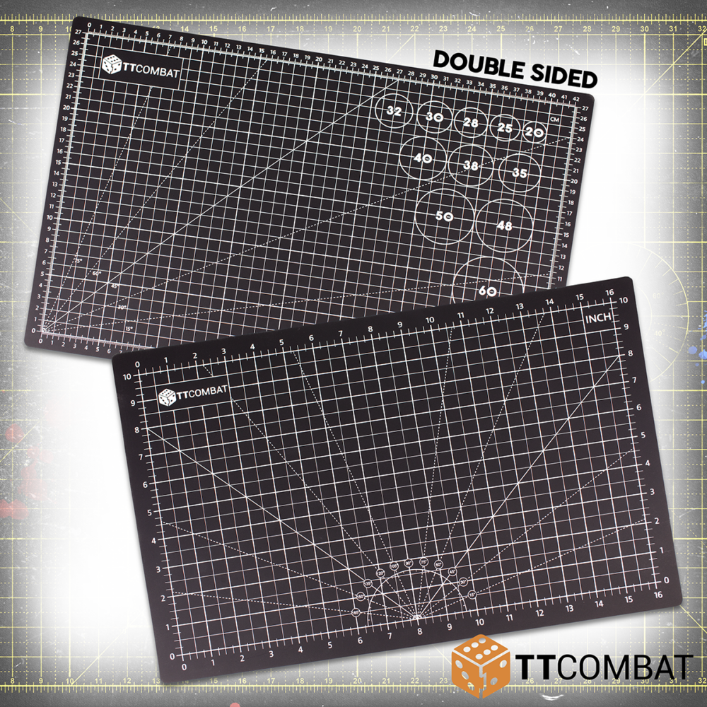TTCombat Double Sided, gridded miniature and MDF Self Healing Cutting Mat. A3 size, 3mm thick with markings for miniature base sizes on one side and measurements on both sides.