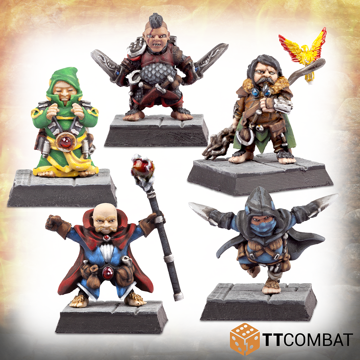 This set contains 5 Halfling Adventurers. This set has a classic party comp of Wizard, Cleric, Fighter, Rogue, and a Druid for good measure.