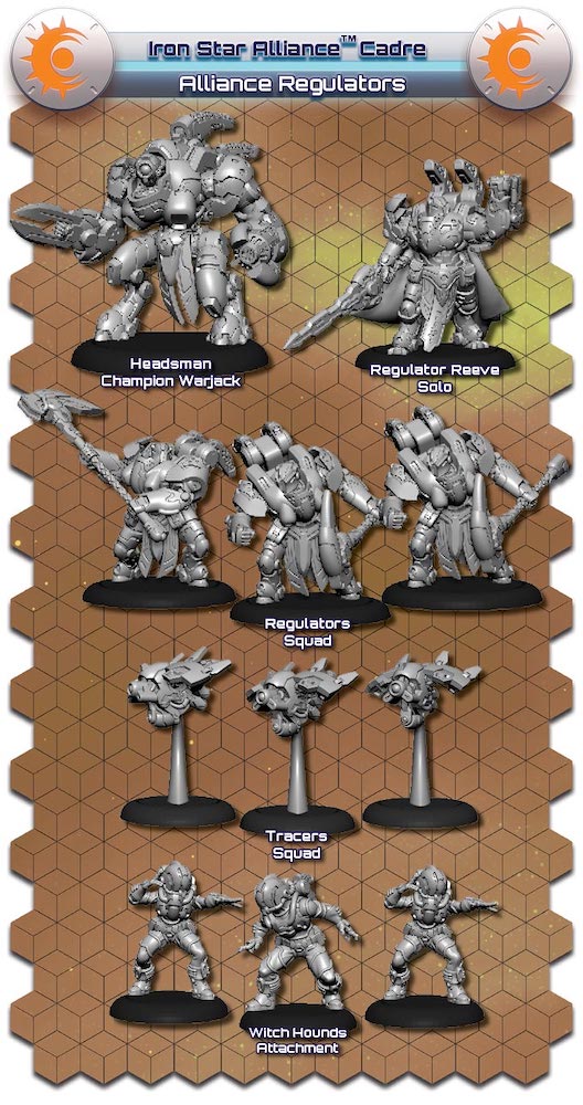 The Regulators are the ISA’s answer to arcane threats. Supporting the empire’s Justicars, this specialist strike force includes a heavily armed and armored Regulator squad backed by an attachment made up of three wyrd Witch Hounds, who use their strange powers to disrupt enemy Cypher effects. The Regulators are additionally backed by a squad of swift-moving Tracer combat drones and are commanded by a Regulator Reeve, a channeler with Arc-disruption capabilities. The Cadre is rounded out by the Headsman, a Champion warjack that carries some of the most powerful mechanikal weaponry ever developed by human hands.
