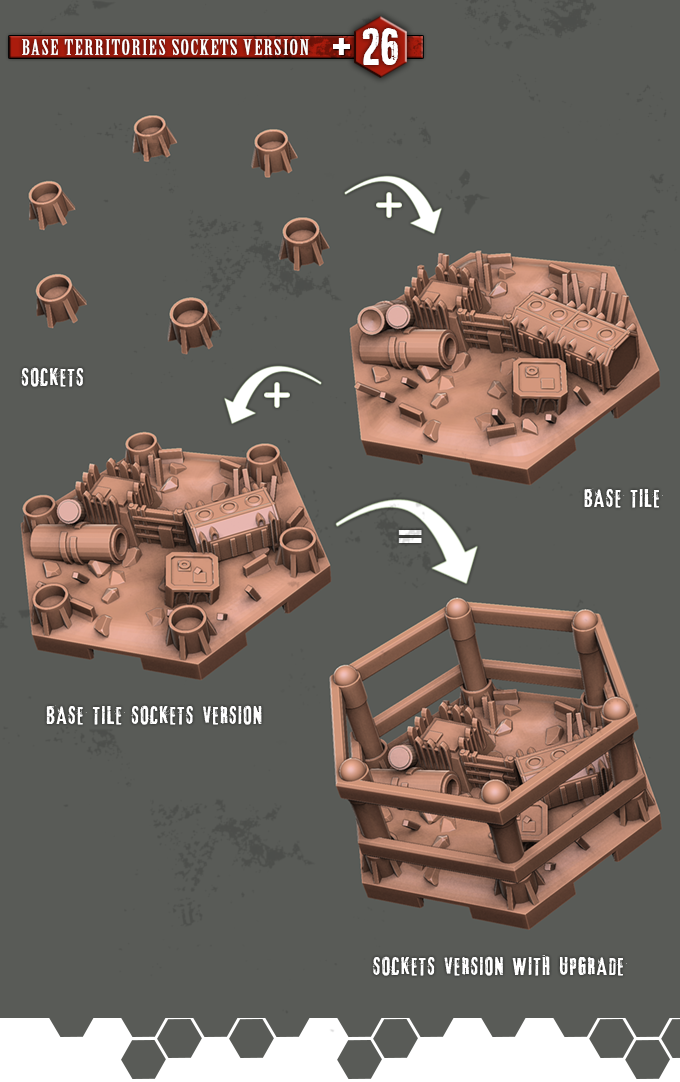 - Each Tile also have 6 carved holes at the back allowing to connect „Upgrades“ . Upgrades comes in 3 Sizes and allow to build stages and rise your Hive. (Tier2)