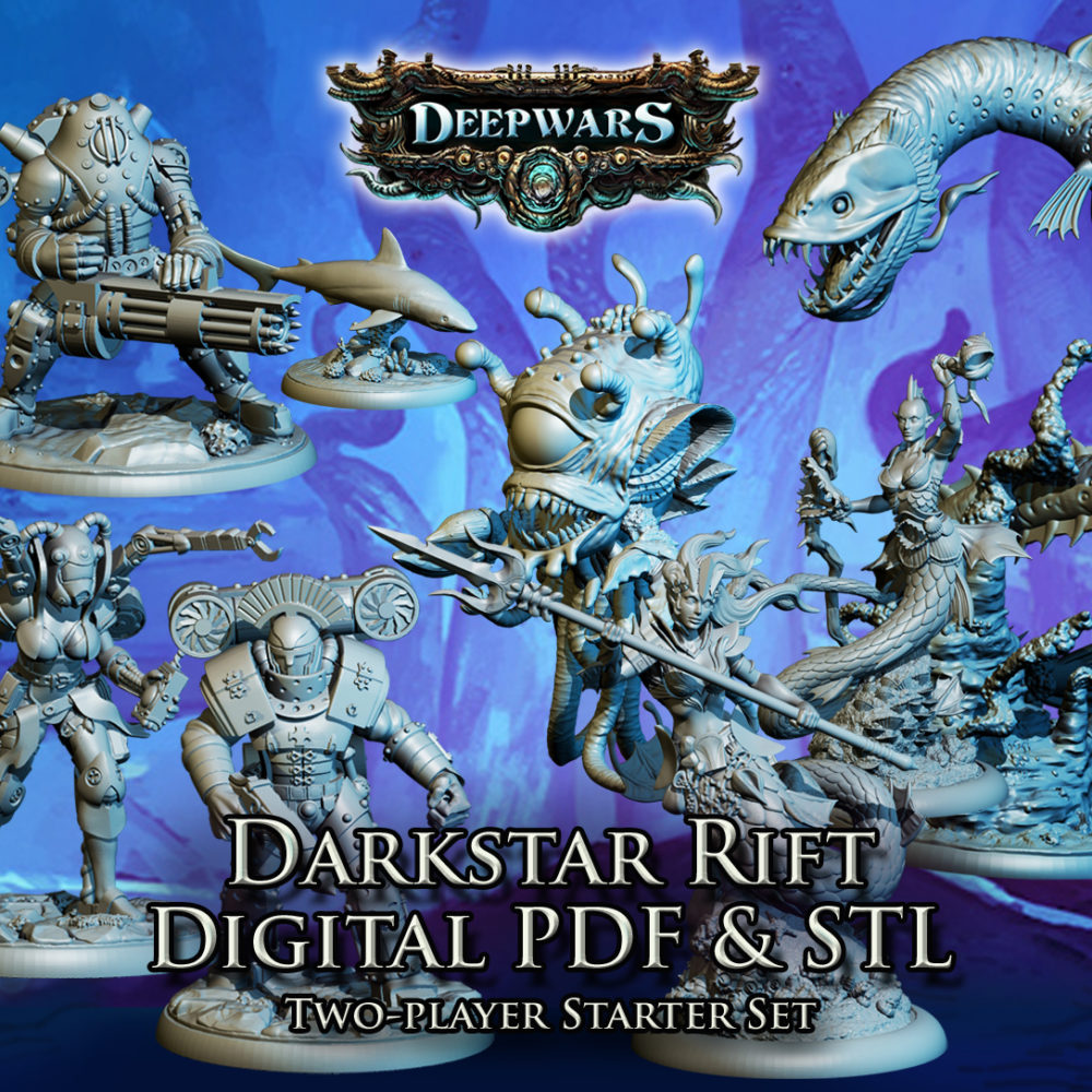 Darkstar Rift is now available as a 3D print-and-play two player starter set for DeepWars.Two players battle in the deadly waters of an underground ocean known as the Shadow Sea, searching for the lost treasures of Darkstar Rift. Battles take place in a deadly underwater forest, amid sunken ruins, within a volcanic rift zone, and finally in an ancient submarine port split apart by a dimensional vortex. The game includes four seafloor maps for the different environments and a narrative campaign with warband and character advancement.Games are played using models representing adventurers, bio-mechanical constructs, wild sea creatures and vehicles. In the Digital version, you get two warbands, the Fortune Hunters and the Nereids, as well as 10 different types of wild creatures, monsters and scenery, all as 3D printable STL files. All 3D models come with pre-supported versions.The game includes a PDF rulebook, digital files for the maps for the scenarios, rulers for movement and measuring range, game counters and markers for treasure and scenic features. Game cards for all warbands and creatures are also included as PDF files.