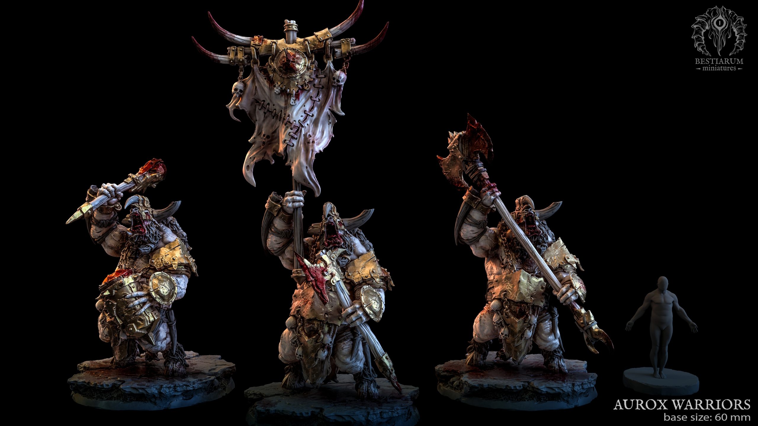 Aurox Warriors – Banner & Drum & two-handed axe – 3 versions. 60mm base