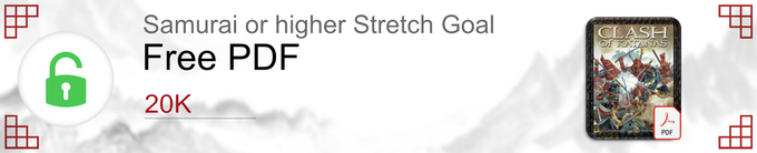 20K – Samurai pledges or higher (level I+) get the free PDF of CLASH of Katanas. The PDF will likely be sent before the main pledges so you can start studying the rules ahead of time !