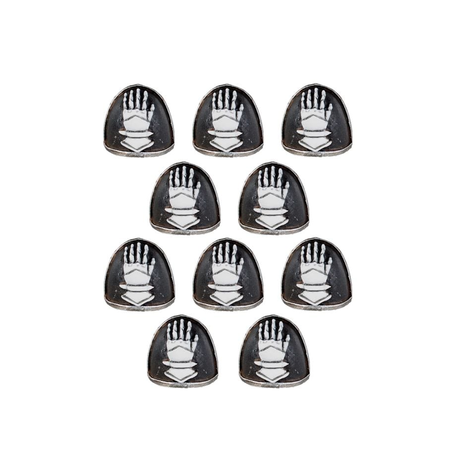 10x Iron Hands sculpted shoulder pads that feature plain trim around their edges and bear the icon of the Iron Hands.