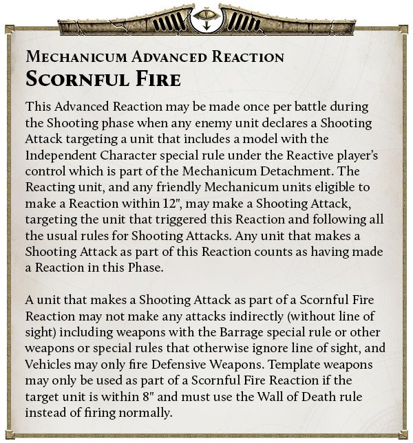 Liber Mechanicum includes all sorts of fun and characterful rules, including many that focus on what the children of Mars do best – shooting the nastiest guns in the Imperium. When your foes level their boltguns at your machine lords, you can remind them who forged those weapons with a volley of Scornful Fire.