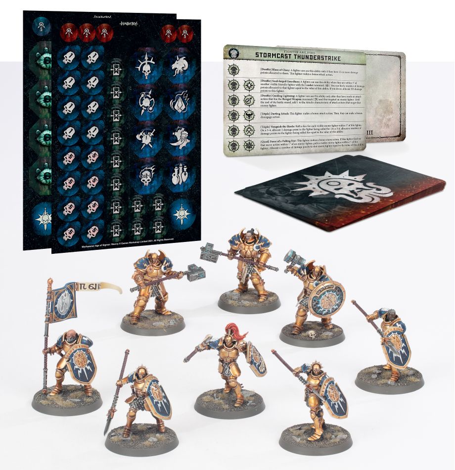– Lebenspunktteiler und Fähigkeitenkarten der Thunderstrike Stormcast Eternals,vollgepackt mit mächtigen Attacken und magischen Effekten, um Sigmars Zorn in die Achtpforten zu bringen