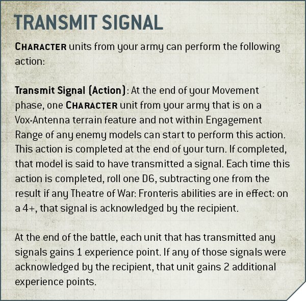 Campaigns set in Nachmund during the current Season of Warhammer 40,000 can benefit from terrain-specific Crusade Agendas found in Vigilus Alone. These include Transmit Signal, which gives your units extra experience points and adds to the ongoing narrative of the war for Vigilus as you transmit messages of hope and despair.**