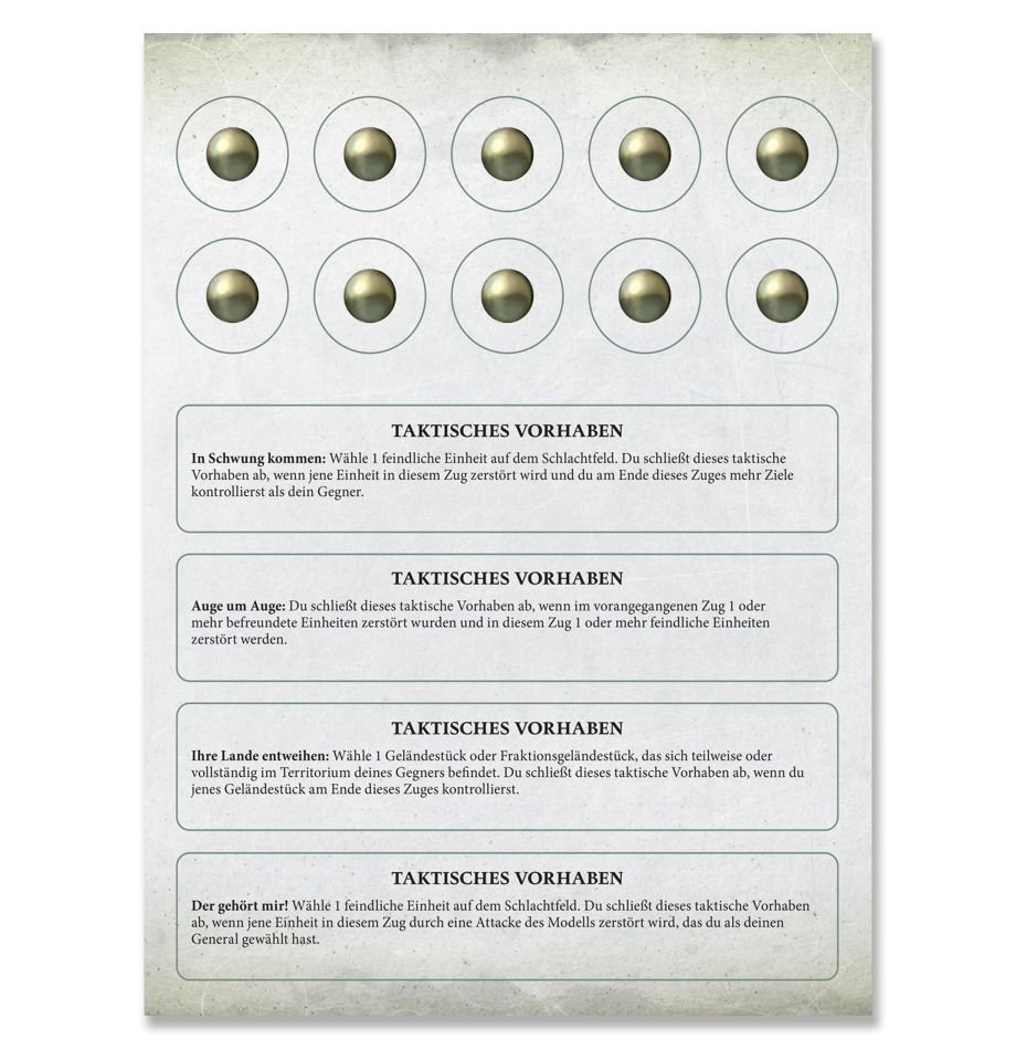 – Sechs strategische Vorhaben, die die Ziele einer Armee bestimmen, da ihre Erfüllung am Spielende Siegespunkte bringt, egal, ob deine Veteranen auf dem Schlachtfeld deine Dominanz beweisen oder du den Kern des Feindes vernichtest, um zu zeigen, dass die Kein Ort für die Schwachen ist