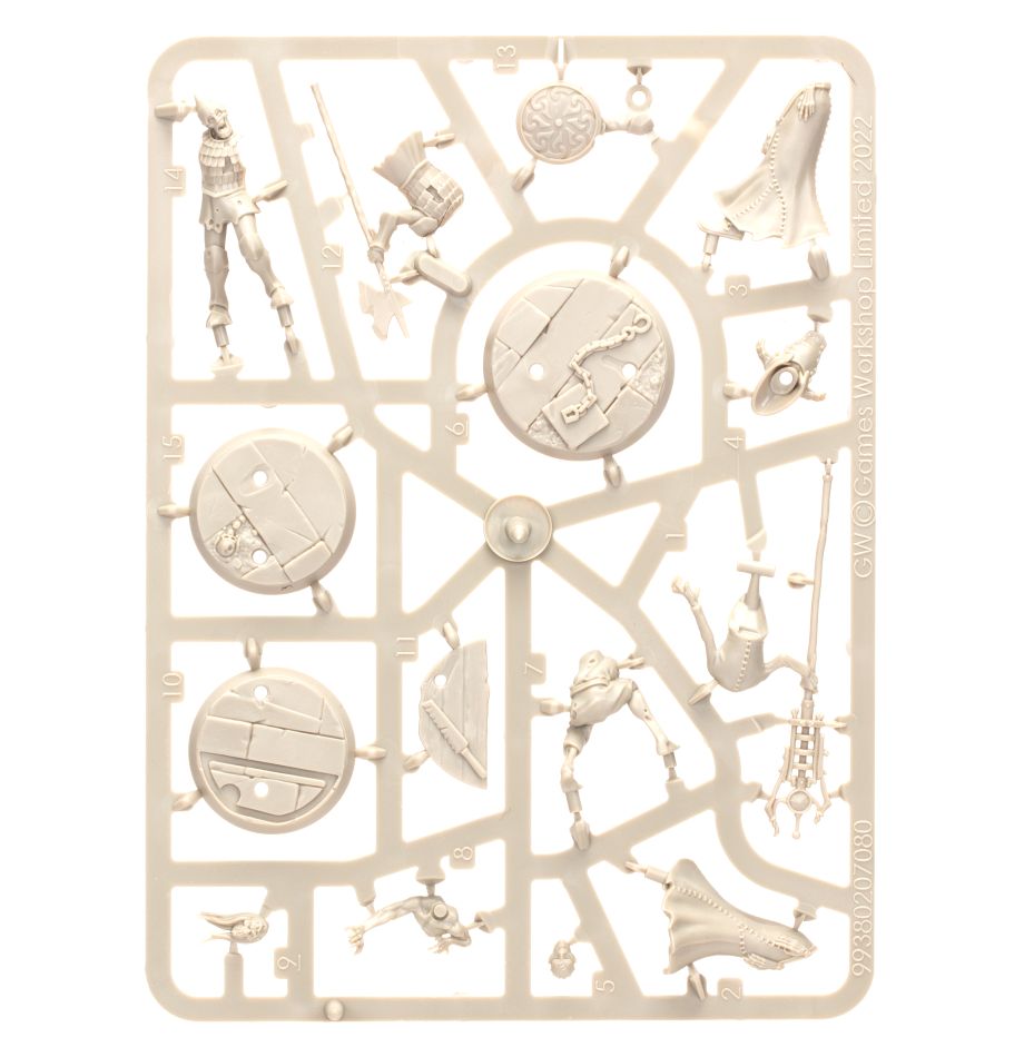 – 7x zusammensteckbare Miniaturen der Verbannten Toten – für das Zusammenbauen wird kein Klebstoff benötigt und sie sind in leichenblassem Grau gehalten, damit sie auch unbemalt ins Auge stechen