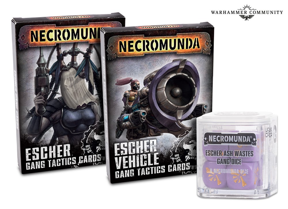 There are two sets of Escher Tactics Cards coming out – one for vehicles, and another for your battles in the underhive. Both contain 18 Escher-specific cards and eight blank cards to keep track of your gangers and vehicles. The Escher Vehicle Tactics Cards contain new cards to use in the ash wastes, while the Escher Gang Tactics set is a reprint of a previous set, and the eight Escher-themed dice are coloured in stylish purple with luxurious golden ink. You get three regular D6s, three Necromunda injury dice, an ammo die, and a scatter die.