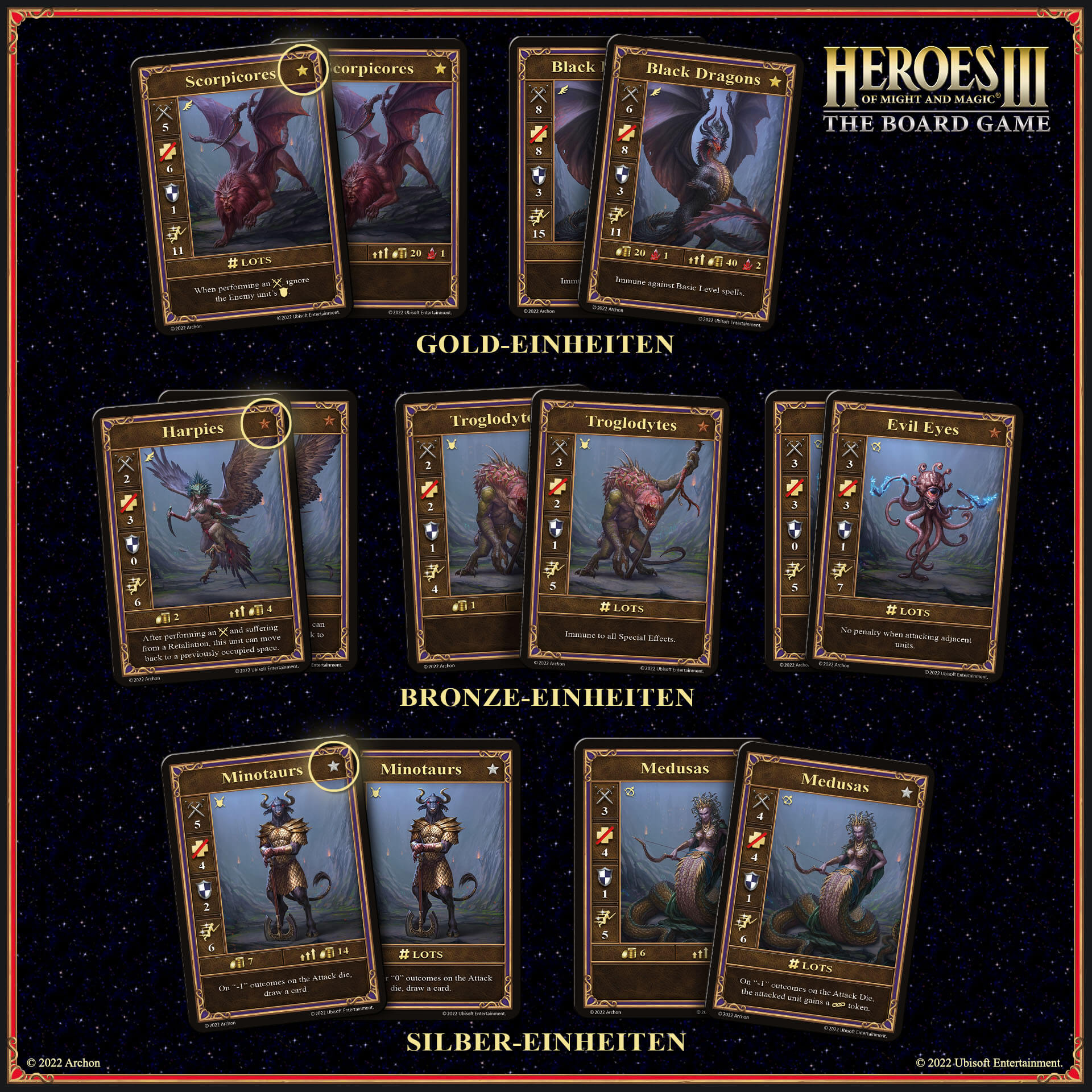 Wie bei den anderen Kernmechanismen des Originals haben wir unser Bestes getan, um sie in das Brettspiel zu übertragen. Das erforderte natürlich einige Vereinfachungen und Arbeitsstunden, um den Spielverlauf flüssig und spannend zu halten. Im Brettspiel stehen jeder Fraktion in der Stadt 7 Einheiten zur Verfügung, aber wie in Heroes of Might and Magic I kann der Held nur 5 von ihnen rekrutieren. Wir haben die Stufen der Einheiten (und ihrer Behausungen) in die folgenden Gruppen eingeteilt: Bronze (Stufe 1-3), Silber (4-5) und Gold (6-7) … Mächtige Drachen haben zu Ehren der mächtigsten Kreatur in Antagarich die Farbe Azurblau erhalten.
